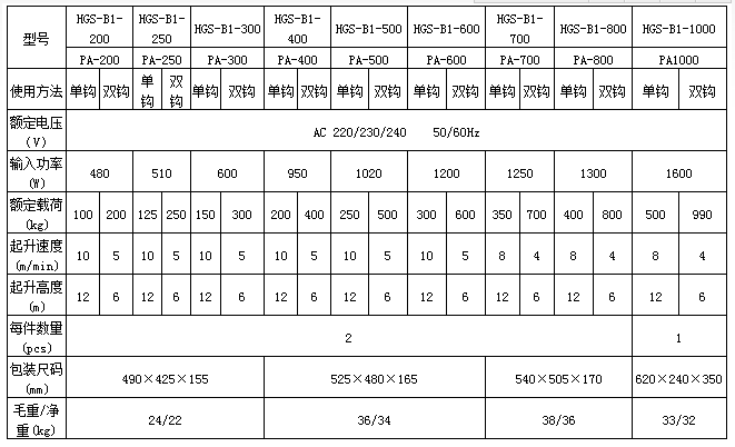 PA400微型電動葫蘆參數(shù)表: